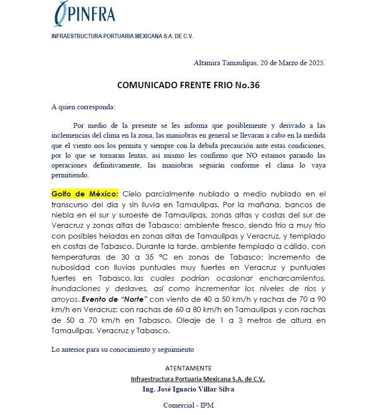 AVISO – FRENTE FRIO NO. 36