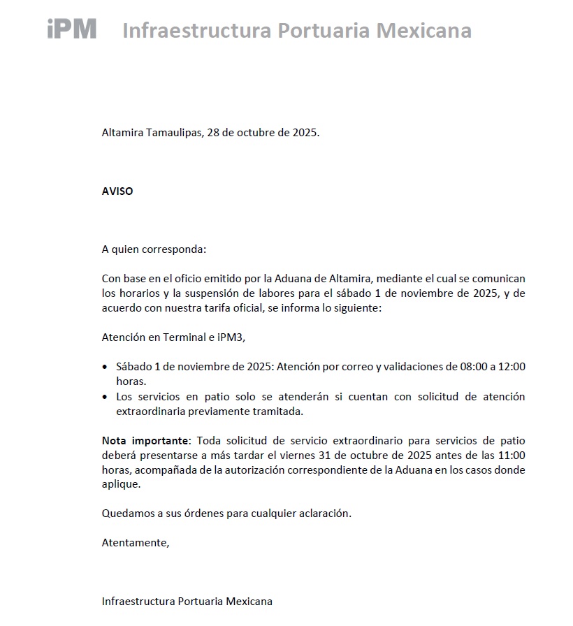 iPM – iPM3 // AVISO DIA INHABIL 01 DE NOVIEMBRE DEL 2025 Estimad@s Buen día Por medio de la presente se les informa el siguiente AVISO. Anexo archivo, Favor de hacer extensivo. Lo anterior Read More